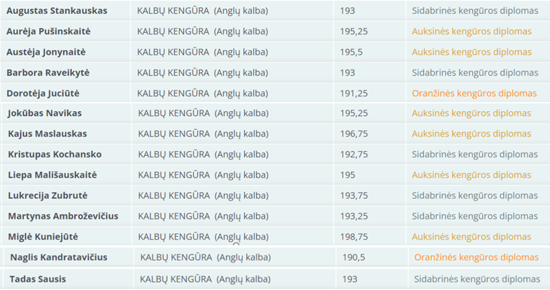 Anglų kalbos kengūros prizininkai. Auksinė kengūra – 4c kl. mokinė Aurėja Pušinskaitė, 3c kl. mokinė Austėja Jonynaitė, mokinys Jokūbas Navikas, 4a kl. mokinys Kajus Maslauskas, 4c kl. mokinė Liepa Mališauskaitė, 3b kl. mokinė Miglė Kuniejūtė. Sidabrinė kengūra: 4c kl. mokiniai Augustas Stankauskas, Martynas Ambroževičius, 3a kl. mokinė Barbora Raveikytė, 3b kl. mokiniai Kristupas Kochansko, Tadas Sausis, 4a kl. mokinė Lukrezija Zubrutė. Oranžinė kengūra: 3a kl. mokinė Dorotėja Juciūtė, 4a kl. mokinys Naglis Kandratavičius. Mokinius rengė mokytojos: Agnė Savastė ir Dovilė Linauskė.