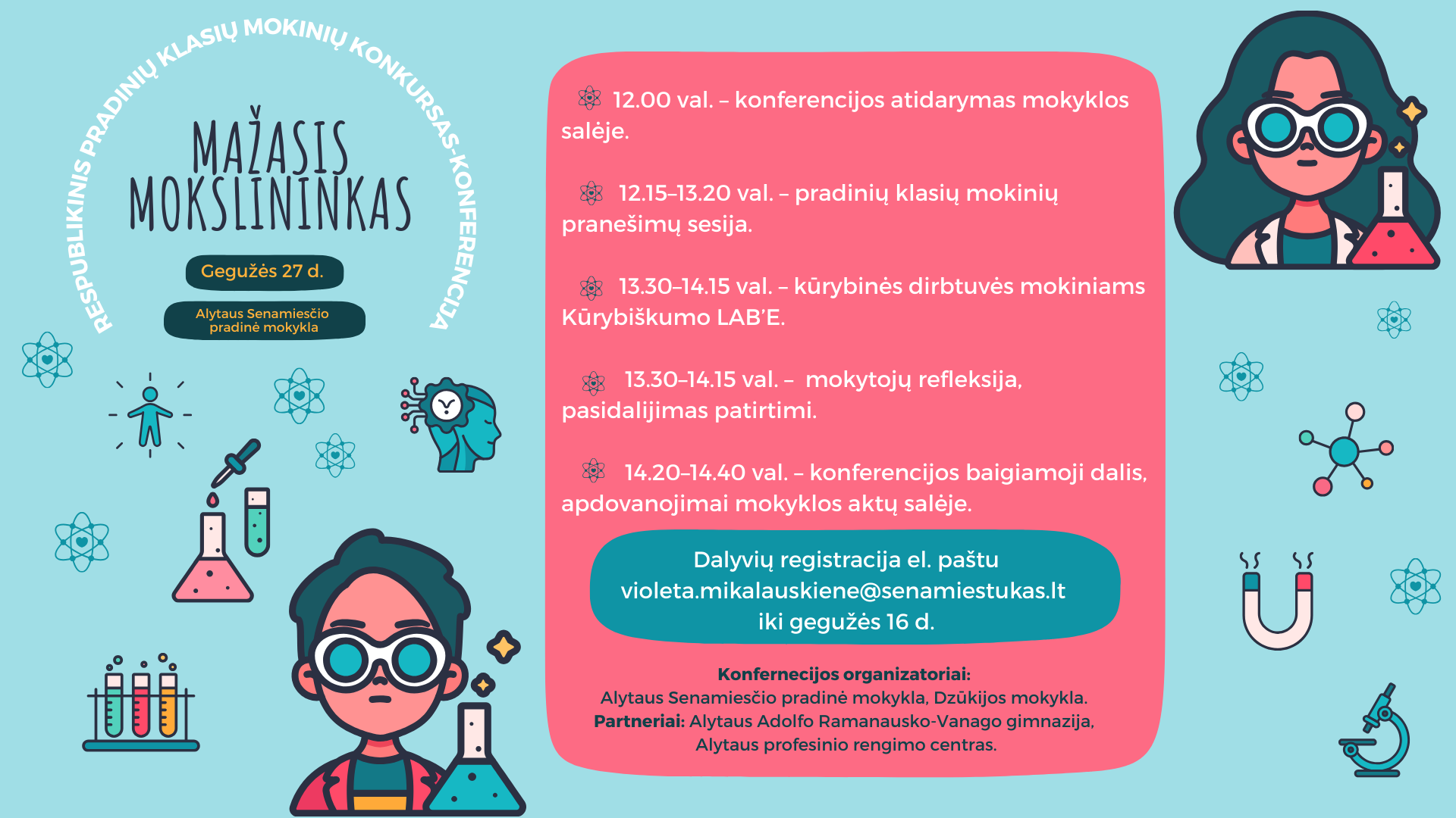 Kviečiame pradinių klasių mokinius dalyvauti respublikiniame pradinių klasių mokinių konkurse-konferencijoje „Mažasis mokslininkas‘ 2025“, kurio tikslas – didinti mokinių domėjimąsi STEAM mokslais, ugdyti jų kūrybiškumo ir komunikavimo kompetencijas.