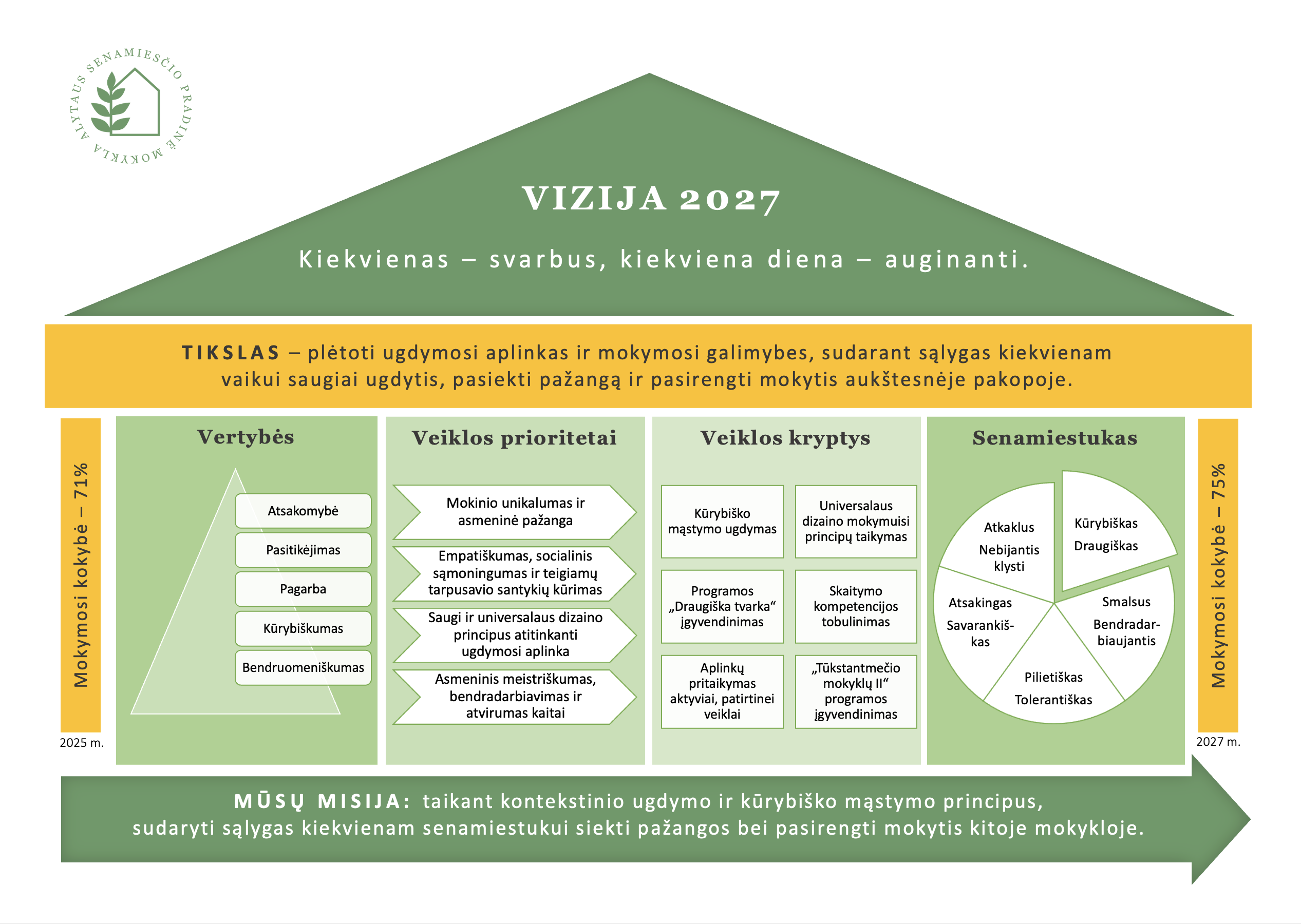 Mūsų misija – taikant kontekstinio ugdymo ir kūrybiško mąstymo principus, sudaryti sąlygas kiekvienam senamiestukui siekti pažangos bei pasirengti mokytis tolimesnėje mokykloje.